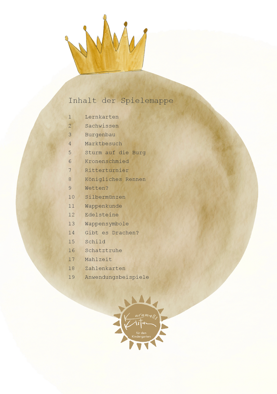 Unsere digitale Spielemappe zum Thema Schloss umfasst 118 Seiten Spielesammlung, 18 Spielmaterialien und 37 Illustrationen im PNG-Format.